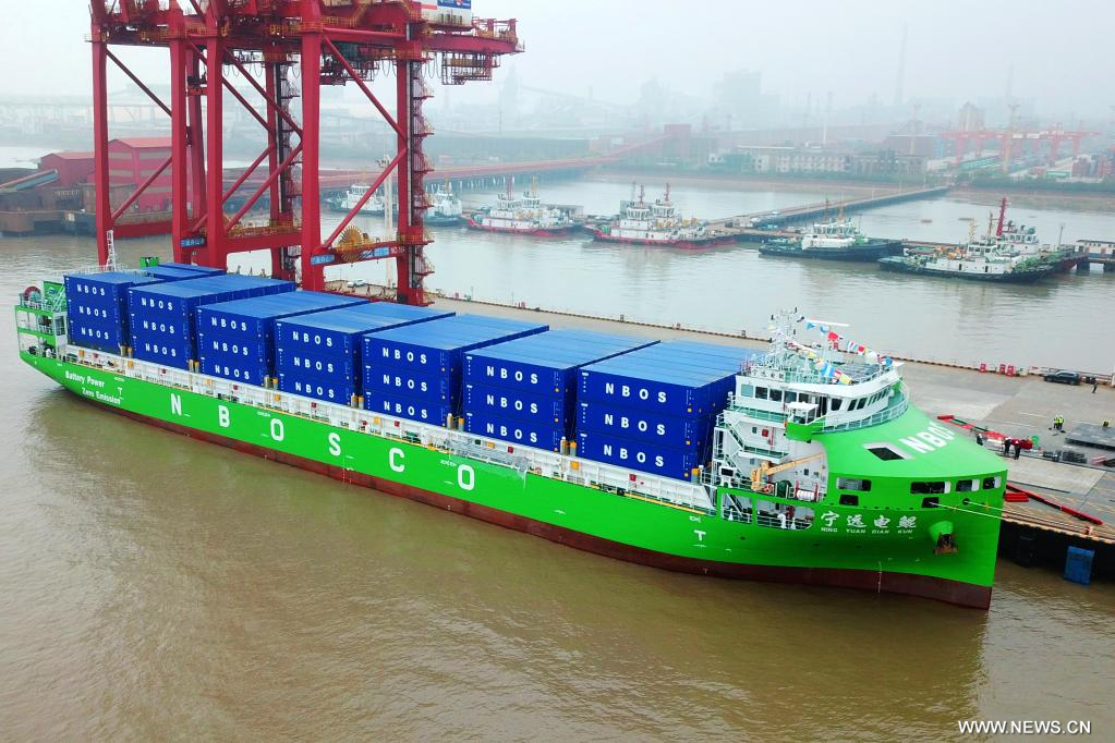 4月15日,全球最大、国内首艘万吨级纯电动智能集装箱海船“宁远电鲲”轮从宁波舟山港北仑港区启航,驶向嘉兴港乍浦港区,标志着该船正式投入商业航线运营。